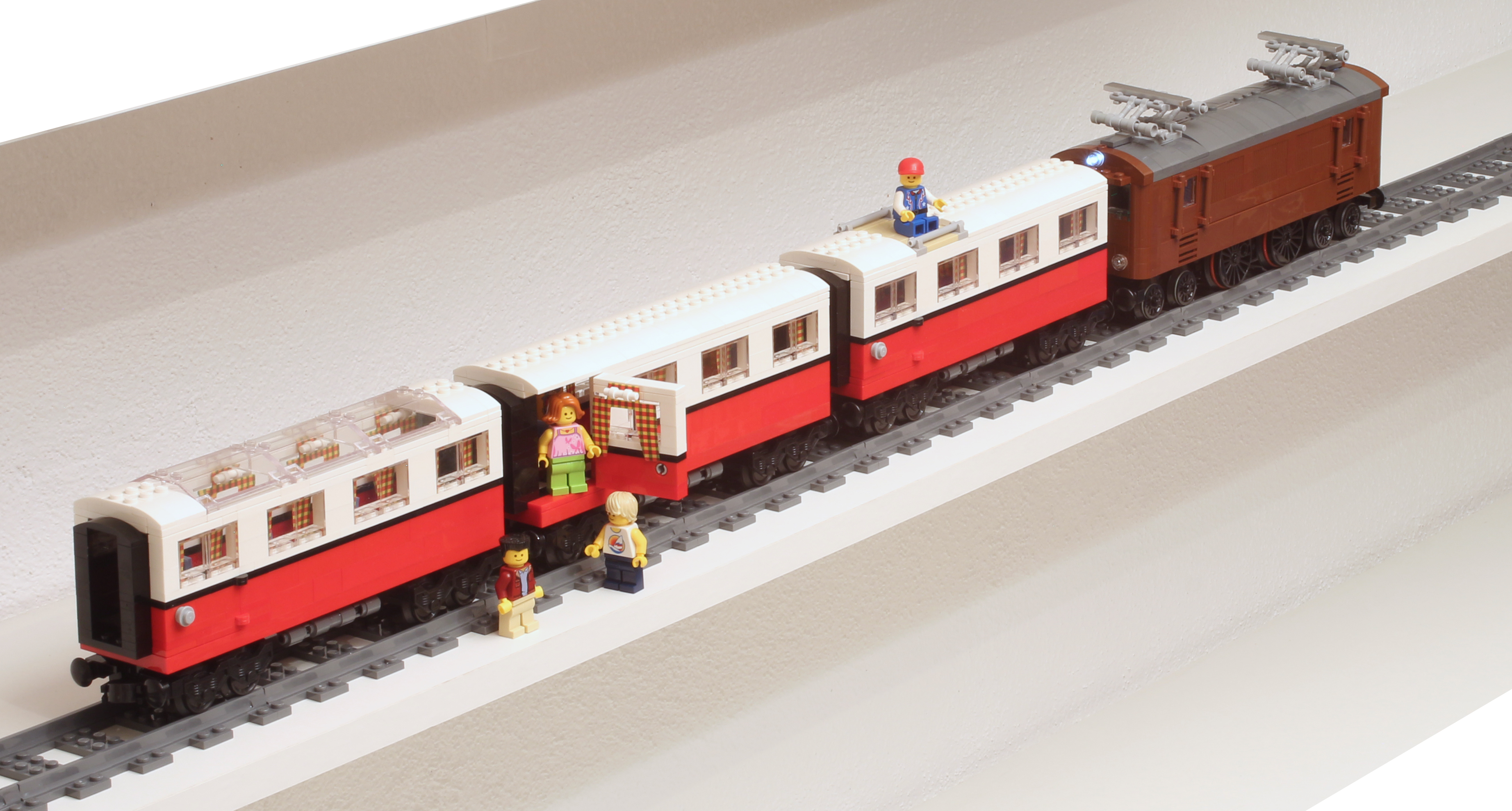 Mon combi VW 10220 était bien joli, mais ne servait à rien... Alors l'idée fut de le déconstruire pour le reconstruire sous forme de wagons, en reprenant les mêmes couleurs rouge/noir/blanc avec les mêmes rideaux si jolis aux fenêtres. Il y a un wagon normal, un wagon porte-bagage sur le toit et un wagon panoramique, toutes les portes s'ouvrent.